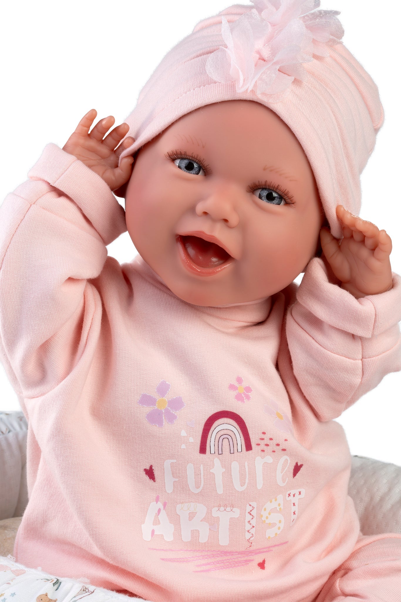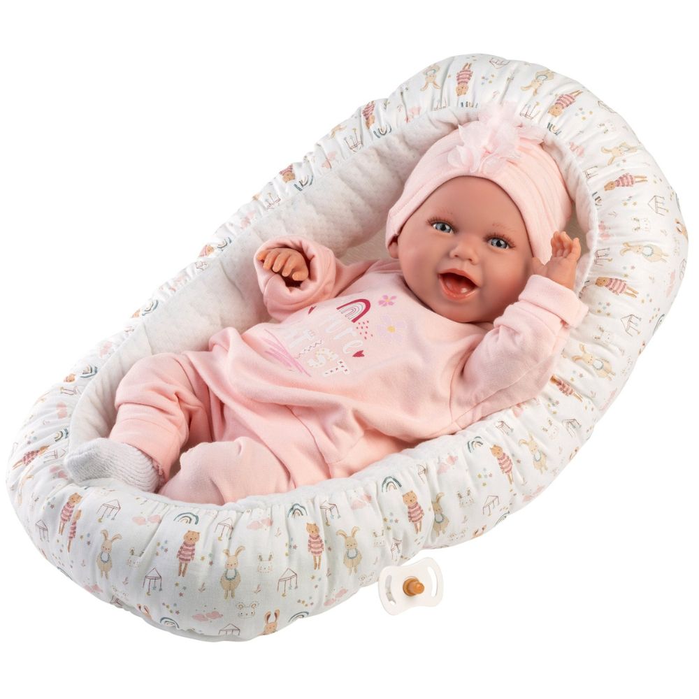 Paige is an adorable newborn doll who loves to laugh and be cuddled. Lay her down in her little bed and watch her charm everyone around her. She has a soft fabric body with beautifully crafted vinyl limbs, and when you gently squeeze her tummy, she giggles and calls out for Mum and Dad—just like a real baby.